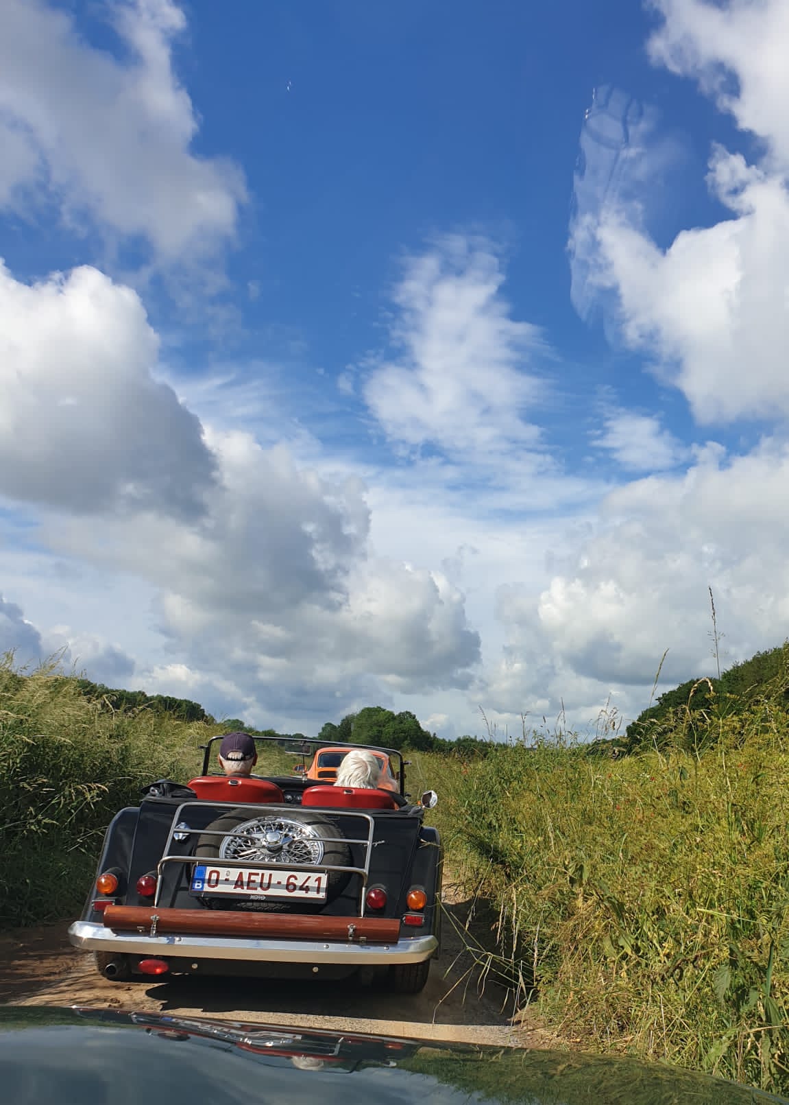 Après un bon petit déjeuner pris parmi des Mustang, Lotus, Mini et autres Jag nous nous sommes mis en route. Roadbook impeccablement fait, soleil juste ce qu'il faut, routes défoncées (càd belges). A un certain moment, bifurcation poir emprunter une "petite route étroite".....