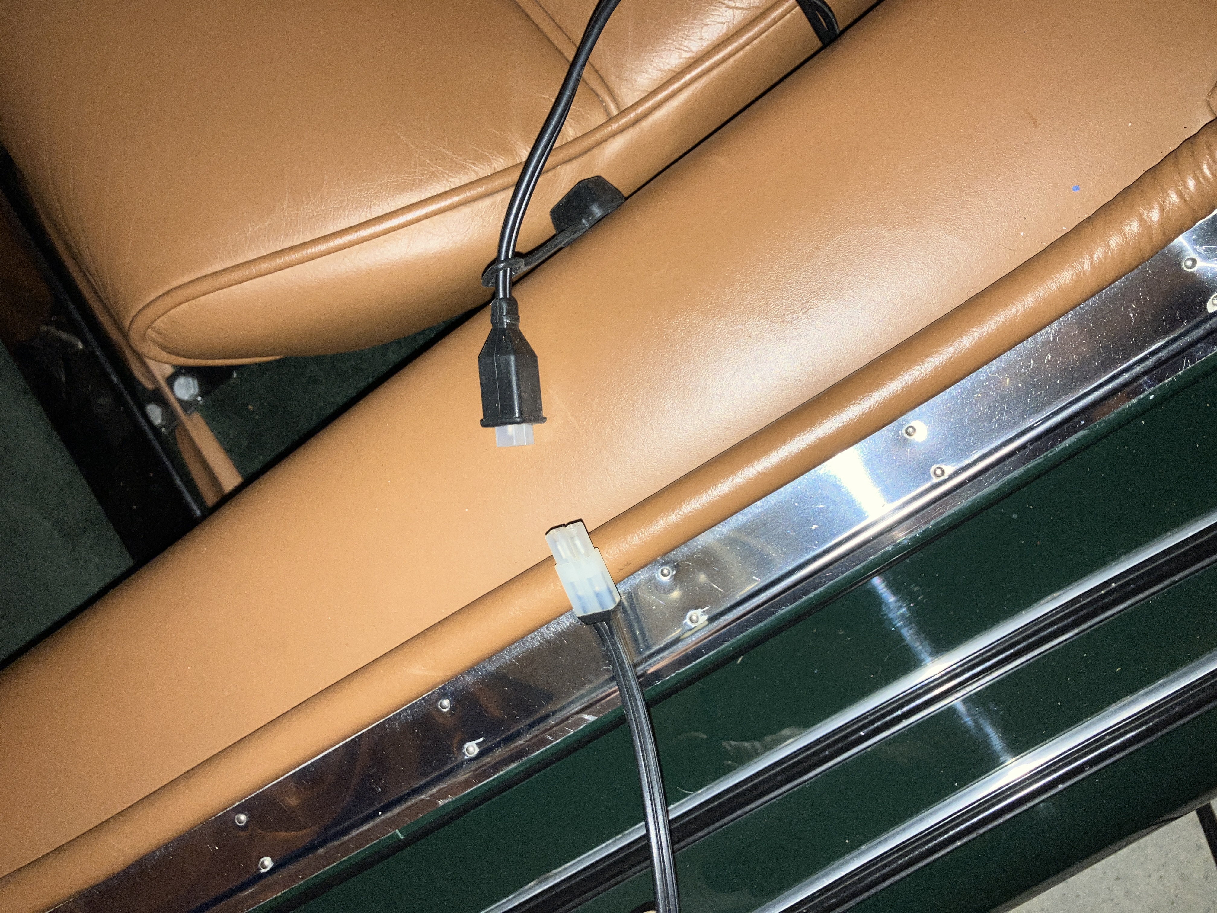 Brancher une rallonge sur les bornes de la batterie, ressortant par la trappe derrière le conducteur, de la longueur que l’on veut, munie d’une prise détrompeur correspondant au modèle de chargeur