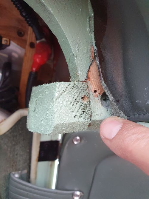 Tant que nous y sommes, les trous de fixations, du nouveau tableau de bord percé en usine pour le fixer sur la structure de l'auto, ne sont plus au même endroit. Il a fallu que je fabrique une cale en bois coté droit car la fixation tombée pratiquement dans le vide. Sur la photo à droite l'ancien trou à gauche sur la cale le nouveau