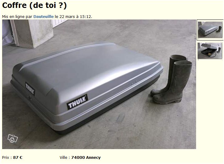 Non, je n'ai pas fait de faute d'ortographe, je viens vous présenter ici quelques articles d'un haut-savoyard plein d'humour que j'invite, s'il nous lit, à nous rejoindre, je trouve que nous sommes un peu mou ces temps-ci, donc premier article, le coffre de toi en vente sur le bon coin, je vous laisse découvrir :