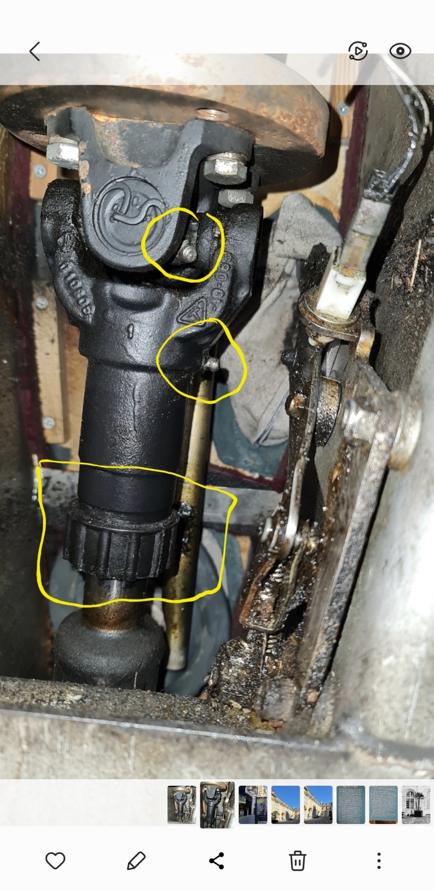 Bref, 20 secondes plus tard, me voilà au garage, sous la caisse. Je joins 2 photos : 1) du graisseur côté gauche (quand on est face à la voiture) ; 2)L'autre, côté droit, avec la pompe dans le graisseur (ou l'inverse). Frappé de voir comme l'emboitement n'est pas si facile...