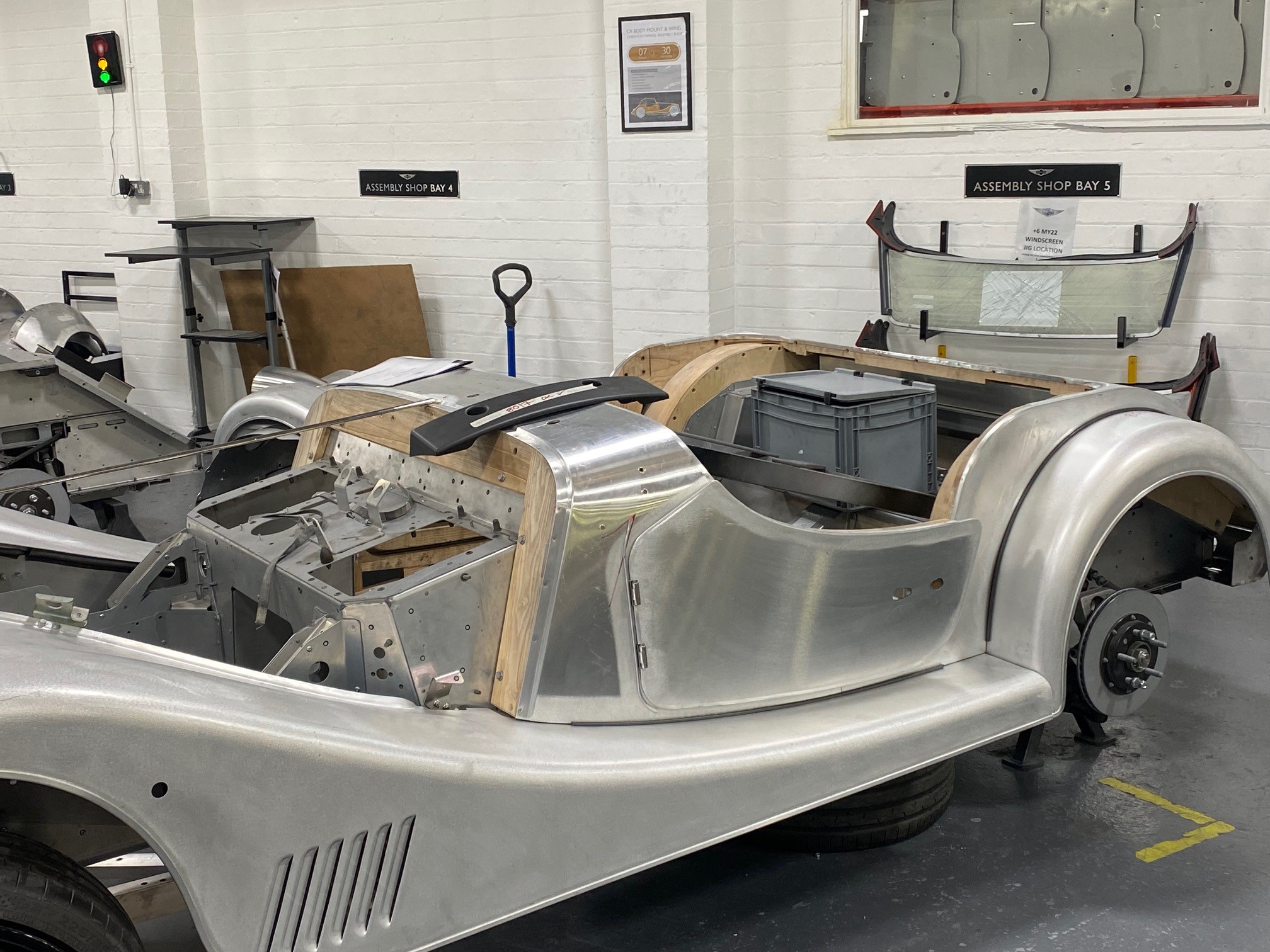 Ramener la voiture jusqu'ici constituait une sorte de pèlerinage. De cette visite, je retiens tout d'abord une sorte de voyage dans le temps… Les ateliers de briques du début du XXe siècle n'ont pas bougé. On y retrouve le charme - un peu désuet, peut-être ?- de cette époque dans laquelle nos fidèles véhicules (j'allais dire montures) sont parfaitement intégrés. Durant la visite de plus de deux heures, nous avons pu déambuler dans chacune des étapes de fabrication des voitures. Peu de choses ont changé dans les différentes étapes d'assemblage… j'ai vraiment trouvé exceptionnelle la partie construction de l'ossature bois, et ajustement de la carrosserie à cette même structure : on admire le boulot des ouvriers (artisans, devrai-je plutôt dire) qui viennent habiller la structure (de la charpente, du meuble) avec des éléments d'aluminium galbés, cintrés, arrondis, parfois ajourés… la beauté de la Morgan sous les mains expertes de ces artistes !