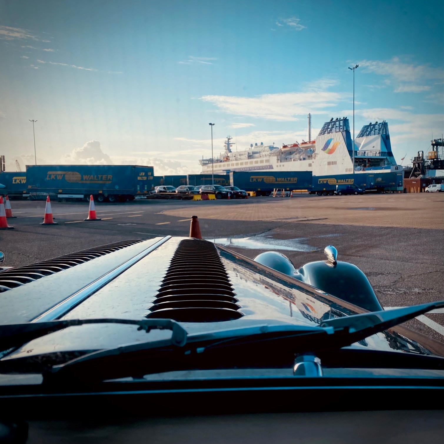 Pour la nuit, pas pu trouver autre chose qu'un hôtel en ville, avec non pas un parking privé, mais seulement un parking public très calme, mais pas forcément sécurisé… Au final, l'hôtel était plutôt pas mal, son restaurant très bien et tout s'est bien passé pour la voiture. La traversée du dimanche matin s'est bien déroulée, avec du personnel de Brittany Ferries qui facilitent bien le transfert en voiture ancienne, en vous mettant sur une file un peu isolée pour ne pas risquer d'accrochage, en vous envoyant sur les rampes quand celle-ci sont totalement libres, pour éviter de devoir s'arrêter, patienter et faire un démarrage en côte, en vous signalant les bosses, les trous…