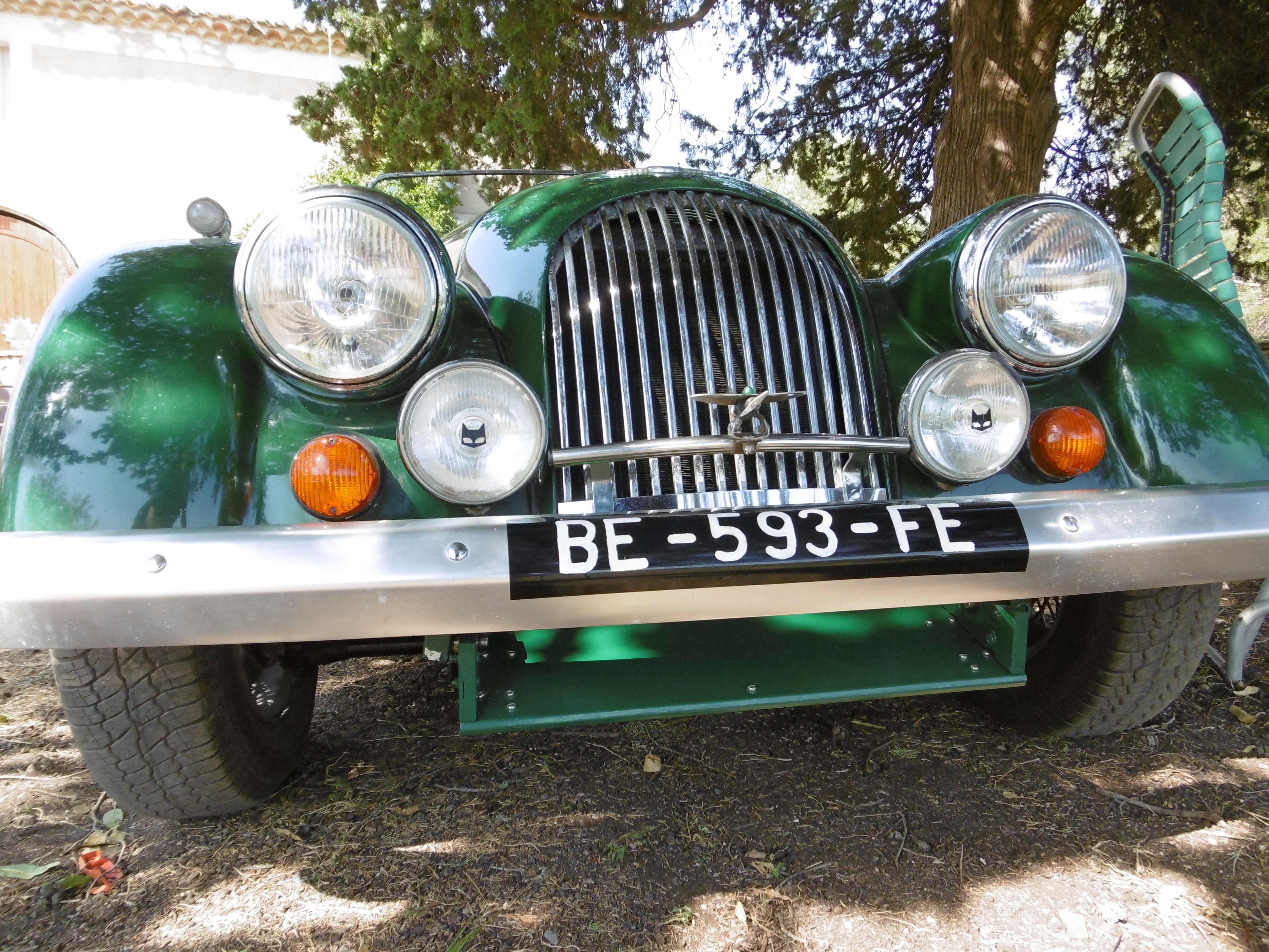 Aprés j'ai recommencé , et donc moults ajustements chronophages , aprés avoir nettoyé mon radiateur qui en avait fort besoin , aprés avoir viré la plaque d'immatriculation et refait celle -ci en provisoire sur le parechoc , aprés avoir viré le klacson qui était monté d'origine devant le radiateur , aprés avoir ajusté , peint et repeint et ratapeint, aprés avoir constaté que les ouvriers Morgan des époques s'arrangeait sans peur avec les mesures pifométriques (2.5cms d'écart entre un coté et l'autre de la voiture!!!) ...... aprés tout ça j'ai tout bien remonté au propre pour essais et donc voilà le bidule :