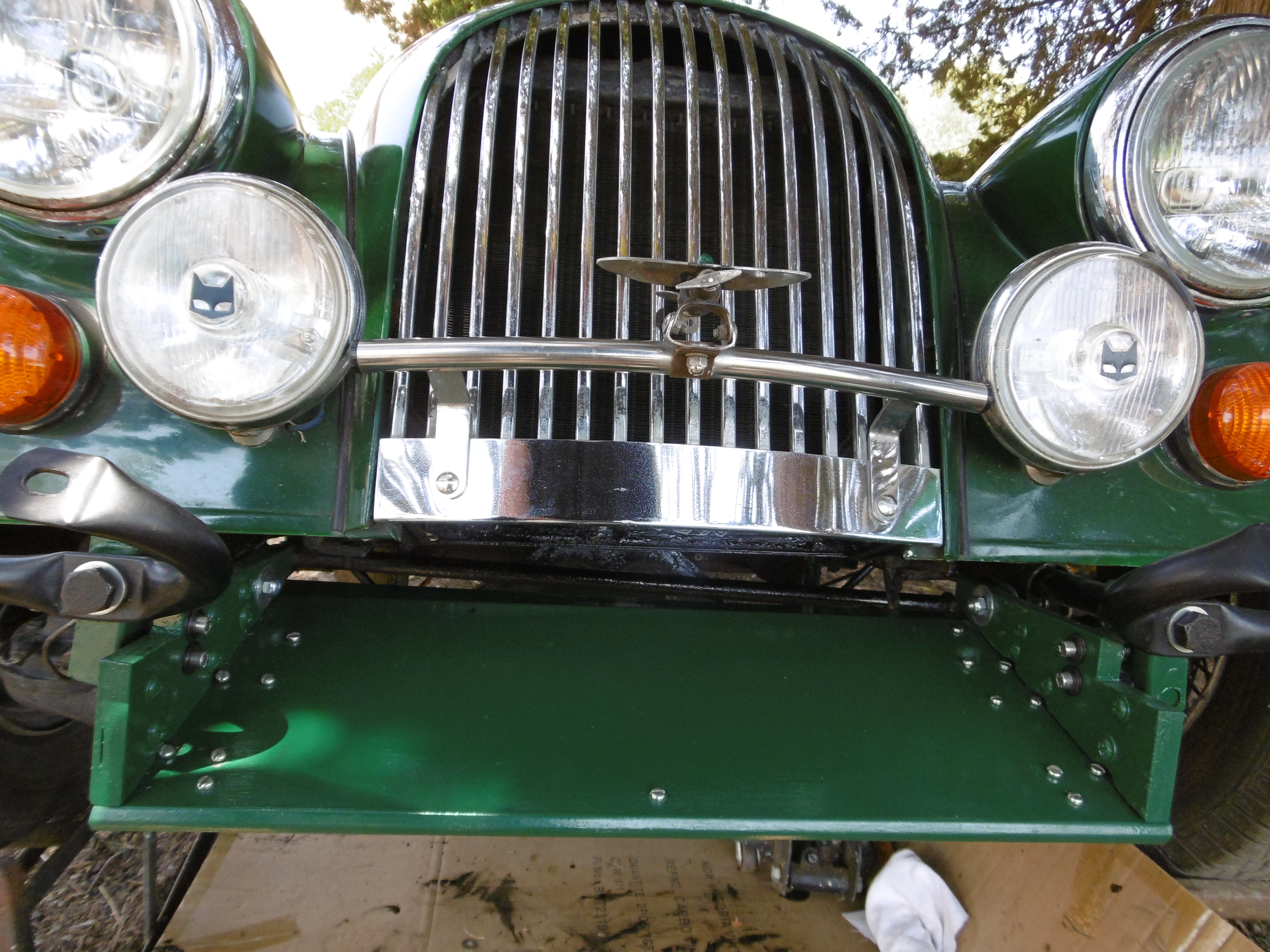 Aprés j'ai recommencé , et donc moults ajustements chronophages , aprés avoir nettoyé mon radiateur qui en avait fort besoin , aprés avoir viré la plaque d'immatriculation et refait celle -ci en provisoire sur le parechoc , aprés avoir viré le klacson qui était monté d'origine devant le radiateur , aprés avoir ajusté , peint et repeint et ratapeint, aprés avoir constaté que les ouvriers Morgan des époques s'arrangeait sans peur avec les mesures pifométriques (2.5cms d'écart entre un coté et l'autre de la voiture!!!) ...... aprés tout ça j'ai tout bien remonté au propre pour essais et donc voilà le bidule :